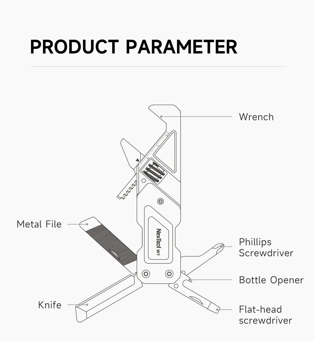 1, 6 in 1 Multi tool : Wrench, Knife, Phillips screwdriver, Flat-head screwdriver, Metal File, Bottle Opener